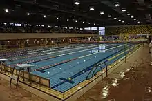 Otro edificio digno de reseñar es la Piscina cubierta, de ocho calles, climatizada, homologada para competiciones internacionales con un amplio graderío con un aforo para 500 espectadores.