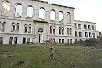 ![]() Ilham Aliyev delante de las ruinas de la Escuela Real de Shusha | ||