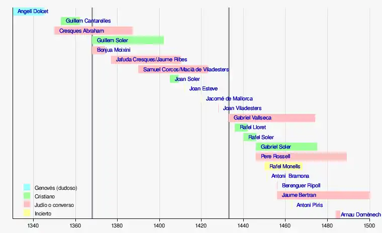 - Angelino Dulcert (Trabajo destacado hacia 1339) Posiblemente un inmigrante genovés. Su estilo no corresponde al que sería el de la escuela mallorquina.