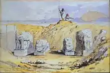 El primer indicio de futuros descubrimientos se produjo en 1820, cuando Claudius Rich, residente británico (una especie de embajador local o cónsul) en Bagdad, y uno de los primeros estudiosos del Antiguo Oriente Próximo, fue a Mosul y al emplazamiento de la antigua Nínive, donde le hablaron de un gran panel en relieve que se había encontrado y que pronto se rompió. Su relato se publicó en 1836; también trajo dos pequeños fragmentos.[63][64] En 1842, el cónsul francés en Mosul, Paul-Émile Botta, contrató a hombres para que excavaran en Kuyunjik, el mayor montículo de Nínive. Poco se encontró hasta que un agricultor local sugirió que probaran en Khorsabad (antigua Dur Sharrukin) en las cercanías, donde «una breve prueba tuvo un éxito espectacular», ya que se encontró un palacio de Sargón II a pocos metros bajo la superficie, con abundantes relieves, aunque habían sido quemados y se desintegraban con facilidad.[65][66]