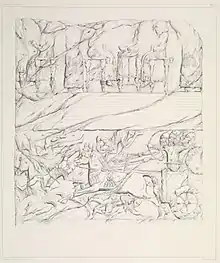 Hay muchos relieves de seres sobrenaturales menores, denominados con términos como genio alado, pero las deidades asirias mayores solo están representadas por símbolos. Los genios a menudo realizan un gesto de purificación, fecundación o bendición con un cubo y cono; el significado de esto sigue sin estar claro.[17] Especialmente en las figuras más grandes, los detalles y los patrones en áreas como los trajes, el pelo y las barbas, los troncos y las hojas de los árboles, y similares, están tallados muy meticulosamente. Las figuras más importantes se muestran a menudo más grandes que otras, y en los paisajes los elementos más distantes se muestran más altos, pero no más pequeños, que los del primer plano, aunque se ha interpretado que algunas escenas utilizan la escala para indicar la distancia. Otras escenas parecen repetir una figura en una sucesión de diferentes momentos, realizando la misma acción, la más famosa un león embistiendo. Pero, al parecer, se trata de experimentos que siguen siendo inusuales.[18]