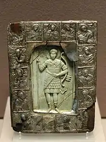 - Período macedónico. El periodo macedonio, iniciado por el emperador Basilio I (año 867) lo es de restauración, aunque no completa, y solo produjo relieves, joyas con camafeos y esmaltes (además de los mosaicos y pinturas) siendo algunos de dichos relieves bastante correctos. Se celebran, sobre todos, el tríptico del Crucifijo y la placa (de marfil también) del Salvador coronando a Romano IV y Eudoxia (año 1068) que se guardan en París y otra placa de marfil con la figura de la Virgen y del Niño, en Utrecht. Asimismo, los relieves de bronce con incrustaciones de plata en las puertas de San Marcos de Venecia (siglo X al XI).