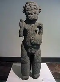 La escultura en piedra alcanzó una vasta producción, con fino acabado. El material más utilizado fue la andesita, obtenida de los volcanes, y se practicaron técnicas de lasqueado y pulimento, alcanzando a elaborar gran cantidad de piezas como metates ceremoniales, guerreros, chamanes, esclavos, animales, cabezas-trofeo, asientos, lápidas, remates de bastones, etc.