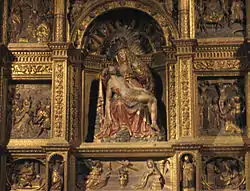 Otro gran ejemplo de retablo mayor fue el del monasterio de Poblet del año 1529 y encargado al escultor Damián Forment. Esta obra supuso en el arte catalán la introducción plena de las formas renacentistas.[17] De estructura a la romana, en alabastro, la superficie se divide en cuatro cuerpos y ático, en la calle central se encuentra la imagen de Santa María junto con escenas de la Resurrección y la Crucifixión, mientras en los cuerpos primeros y tercero realizó los misterios del Rosario, en el segundo y cuarto representación de imágenes de santos y en el ático la culminación con el Calvario.[18]