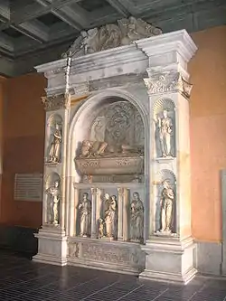 La estructura de los sepulcros, fue cambiando de la simple losa o lauda con algún grabado, a la de la estatua del difunto sobre el sarcófago en posición yacente o en actitud orante. La arquitectura solía ser de arco de triunfo adosado al muro y con una representación parecida a un retablo, donde la figura del fallecido ocupaba la parte central o todo el monumento exento, que solía colocarse en medio de la capilla funeraria.[9]