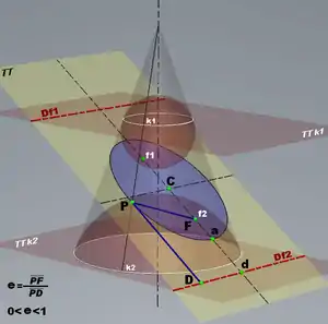 - Si (como ocurre a menudo) se toma la definición de la elipse como el lugar geométrico de los puntos P tal que d(F1, P) + d(F2, P) = 2a (siendo 2a una constante igual al eje mayor), entonces el argumento anterior demuestra que la intersección del plano π con el cono es en realidad una elipse.