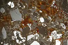 Bajo el microscopio, las esferulitas tienen un contorno circular y se componen de fibras divergentes delgadas que son cristalinas como verifica la luz polarizada. Entre prismas de Nicol cruzados, una cruz de color negro aparece en la esferulita; sus ejes son generalmente perpendiculares entre sí y paralelos al punto de mira; cuando la platina del microscopio se hace girar la cruz permanece constante; entre los brazos negros hay cuatro sectores brillantes. Esto muestra que la esferulita consiste en irradiar, fibras birrefringentes que tienen una extinción recta; los brazos de la cruz negra corresponden a aquellas fibras que se extinguen. El cemento tiene un grano demasiado fino como para determinar directamente qué minerales lo componen utilizando un microscopio de luz visible.