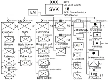 La zona de Novska; Pakrac; Nova Gradiška; Požega; Slatina estaba bajo la responsabilidad del 5.° Cuerpo (Banja Luka), del 1.e Distrito Militar. Dicha gran unidad tenía la mayoría de sus unidades en Bosnia. En Croacia, contaba con un batallón de seguridad de frontera en Slatina y una división de las movilizar de las TO croatas en Požega (donde se encontraba un batallón de transporte y un centro de instrucción). Este cuerpo tendrá la responsabilidad de las próximas operaciones de Eslavonia Occidental. El cuerpo limitaba al oeste con el 17.º con escasa implicancia en la lucha en la región.