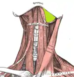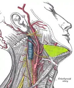 ![]() Espacio submandibular derecho situado en la superficie del músculo mieloide, entre los abultamientos anterior y posterior del músculo digástrico (resaltado en verde). | ||