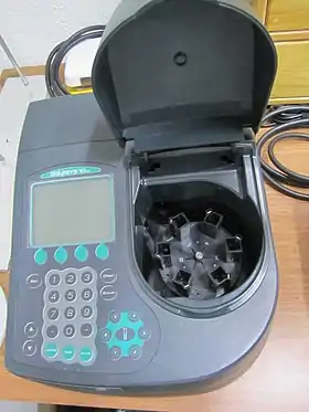 Un espectrofotómetro es un instrumento usado en el análisis químico que sirve para medir, en función de la longitud de onda, la relación entre valores de una misma magnitud fotométrica relativos a dos haces de radiaciones y la concentración o reacciones químicas que se miden en una muestra. Sus aplicaciones pueden ser cualitativas y cuantitativas. También se utiliza en laboratorios de microbiología para la cuantificación de microorganismos.
