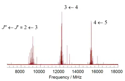 3I. Cada transición rotacional está marcada con el número cuántico J del estado inicial y final , y están altamente desdobladas debido a los efectos del acoplamiento cuadrupolar nuclear con el núcleo de 127I.