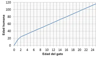 La edad de un gato de un año es comparable a la de un ser humano de 15 años. Su comparación con la edad humana no es lineal, progresivamente la equivalencia decrece, como se ilustra en el siguiente diagrama, de forma que 15 años de la vida de un gato serían equivalentes a entre 75 y 80 de la vida de un humano.[5][6]