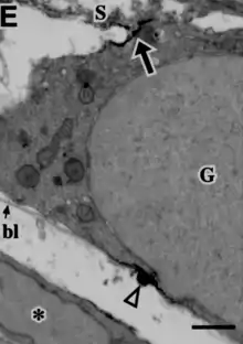 [[File:Sertoli Gonias.png|500px|alt={{{Alt|Espermatogonias G= núcleos (arriba). S= núcleo de Célula de Sertoli, Microscopio electrónico.]]