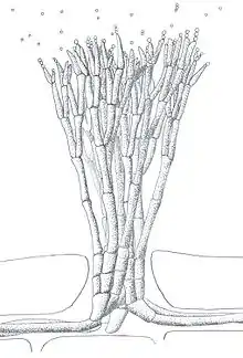 Los esporodoquios aparecen sobre la superficie del micelio del hongo, que toma morfología almohadillada en la zona donde aparecen estas estructuras, como una masa apretada de conidióforos cortos, simples o ramificados, formando un grupo compacto a partir de las hifas subyacientes.[4]