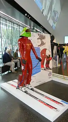 Se utilizan esquíes especiales con una longitud máxima de 2,4 m, anchura máxima de 10 cm y peso máximo de 15 kg cada par. Los bastones están doblados para ajustarse al cuerpo y deben tener una longitud mínima de 1 m.