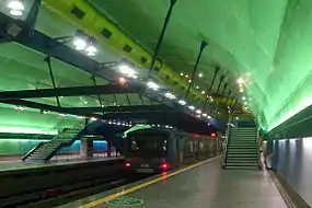 Estación subterránea con hall de boleterías y bloqueos ubicados en el nivel de la calle sobre una estructura metálica en forma de tronco de cono, revestida con piel de vidrio laminado verde.[1]