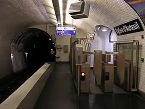 Está diseñada en bóveda y revestida completamente de los clásicos azulejos blancos biselados del metro parisino. Su iluminación ha sido renovada empleando el modelo vagues (olas) con estructuras casi adheridas a la bóveda que sobrevuelan el andén proyectando la luz principalmente hacia arriba. La señalización por su parte usa la moderna tipografía Parisine donde el nombre de la estación aparece en letras blancas sobre un panel metálico de color azul. Por último, los escasos asientos de la estación son de color naranja, individualizados y de tipo Motte.