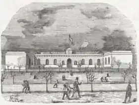 Adosado al edificio, en su parte posterior, se construyó un cobertizo de hierro de dos cuerpos (terminado en 1849), de 120 metros de largo, con techo vidrio y zinc. Este tinglado se destinó a cubrir las vías y andenes. El conjunto del recinto ferroviario se completaba con un depósito de agua, un almacén para el material rodante y las viviendas de los empleados.[3]