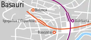 Basauri es una estación subterránea del metro de Bilbao, situada en el municipio homónimo y que comenzó a funcionar el 11 de noviembre de 2011,[2] convirtiéndose en la estación de destino de la línea L2 del metro de la capital vizcaína,[3] y dando por finalizado el proyecto inicial de la red de ferrocarril metropolitano en el extremo este.[4]