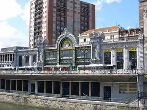 La estación fue inaugurada junto con la línea de Bilbao a Portugalete y Triano, el 19 de marzo de 1888. El proyecto original, en superficie, fue obra del ingeniero donostiarra Pablo Alzola y Minondo. El edificio, de estilo modernista, se ganó el apodo de "la pajarera" o "la capilla" entre los bilbaínos, debido a la torrecilla que presidía el tejado.[5] El edificio resultó muy dañado durante la Guerra Civil española y tuvo que ser demolido en 1937. Tras la guerra se construyó una nueva estación soterrada.[6]