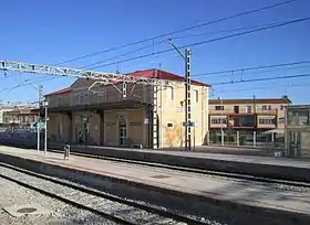 Se encuentra en el centro del núcleo urbano. Dispone de un amplio edificio para viajeros, de planta rectangular y dos alturas formado por tres cuerpos de similares proporciones. Ambas fachadas están adornadas con dos sencillos frontones triangulares. Cuenta con dos andenes, uno lateral y otro central al que acceden tres vías. Una marquesina metálica adosada al edificio principal cubre parcialmente el andén lateral.