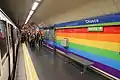 Plataformas de la estación decoradas con los colores de la bandera LGBT.