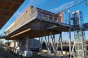 El edificio de viajeros, con una superficie de 385 m2 está construido sobre pilotes, y se conecta a las paradas de autobús cercanas por una pasarela de 120 metros.