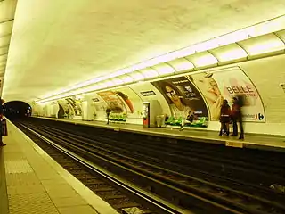 La estación está diseñada en bóveda elíptica revestida completamente de los clásicos azulejos blancos biselados del metro parisino.