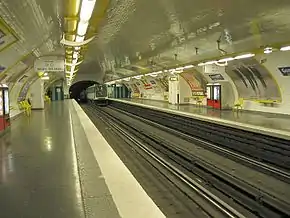 Está diseñada en bóveda elíptica totalmente revestida de los clásicos azulejos blancos del metro parisino, aunque en este caso son planos, sin biselar.