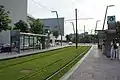 La estructura de la parada es la habitual. Está compuesta por un módulo integrando los servicios de expendedor de billetes, teléfono y reloj digital, y unidades de energía, comunicación y tráfico, unido a un pórtico acristalado en cuyo extremo se ubica un panel publicitario.