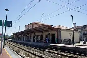 - Un tren de Media Distancia de RENFE entrando en la estación de Guillarey procedente de Vigo, donde remata su recorrido para regresar a continuación a Vigo.