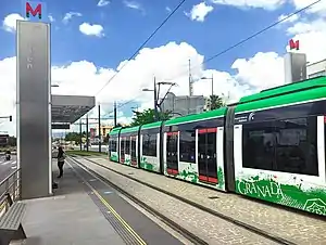 ![]() Una unidad del metro de Granada a su paso por la estación. | |||||||||