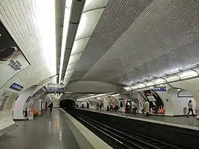 Está diseñada en bóveda y revestida completamente de los clásicos azulejos blancos biselados del metro parisino.