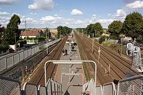 ![]() Vista del andén central desde la pasarela que da acceso a la estación. A la derecha las dos vías sin parada. | |||||||||
