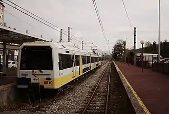 ![]() Vista de los andenes de la estación, con una unidad de la serie 3800 de la extinta FEVE (actual Serie 438 (f) de Renfe) | |||||||||