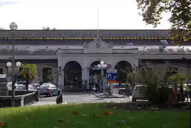 ![]() Imagen de la fachada de la Estación de Pau desde el otro lado del puente sobre el gave de Pau. | ||