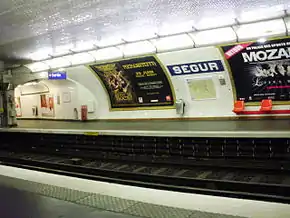 Está diseñada en bóveda elíptica revestida completamente de los clásicos azulejos blancos biselados del metro parisino, con la única excepción del zócalo que es de color marrón. Los paneles publicitarios emplean un fino marco dorado con adornos en la parte superior.