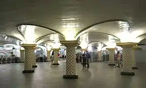 Está diseñada en bóveda elíptica revestida completamente de los clásicos azulejos blancos biselados del metro parisino con la única excepción del zócalo que es de color verde, el mismo color que rodea los paneles publicitarios.