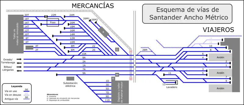 La vía 8 se destina al estacionamiento de los Trascantábrico debido a su 268 m de longitud útil. El resto de vías se destina al apartado de composiciones, en especial las vías 6, 4, 3 y 5, cuyos topes se sencuentran en los extremos de los andenes centrales. Todas las vías se cierran en dos pares generales, 8A, 2A, 1A y 7A, correspondientes a ambos sentidos de las líneas a Oviedo/Torrelavega y Bilbao/Liérganes, respectivamente.