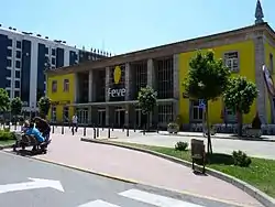 ![]() Fachada de la estación en 2018, con la señalización de Renfe Feve (actualmente Renfe Cercanías AM). | ||||||||||||||||