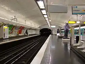 En su diseño, esta estación en bóveda es absolutamente clásica con un predominio absoluto de los habituales azulejos blancos biselados del metro parisino.