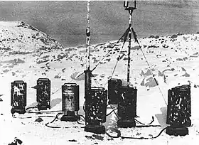Para recopilar más información meteorológica, los alemanes desarrollaron la estación meteorológica automática Wetter-Funkgerät Land (WFL). Fue diseñado por el Dr. Ernst Ploetze y Edwin Stoebe. Veintiséis de estas estaciones fueron fabricadas por Siemens. [3] El WFL tenía una serie de instrumentos de medición, un sistema de telemetría y un transmisor de tipo Lorenz 150 FK de 150 vatios. [4] Consistía en diez botes cilíndricos, cada uno de 1 metro (3,3 pies) por 47 cm de diámetro ( 1,5 metros (4,9 pies) de circunferencia) y pesaba alrededor de 100 kilogramos (220 lb). [2] Un recipiente contenía los instrumentos y estaba conectado a un mástil de antena de 10 metros (33 pies). [2] Un segundo mástil más corto llevaba un anemómetro y una veleta. Los otros botes contenían las baterías de níquel-cadmio [5] que alimentaban el sistema. El WFL enviaría lecturas meteorológicas cada tres horas durante una transmisión de dos minutos en 3940 kHz.[2] El sistema podría funcionar hasta por seis meses, dependiendo de la cantidad de cartuchos de batería.