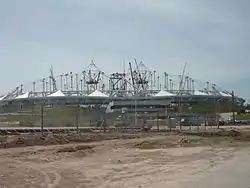 - 4 Vestuarios de jugadores (2 en cada edificio de apoyo) que incluyen gimnasio de precalentamiento, salas de masajes y piletas de.