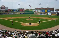 - Asiento del Césped-Permite aún más ventiladores, con las mantas o las sillas del césped, para mirar el juego. Hay también un cierto asiento del bleacher a lo largo de las paredes a lo largo del campo izquierdo. Amplía la capacidad oficial sobre a 7500.