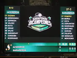 La pantalla cuenta con tecnología Led, fue fabricada por la empresa estadounidense Daktronics, se instaló en un lapso de 5 días, en esta pantalla se despliega información de los bateadores, así como los line-ups de los equipos, y también la pizarra. El estadio, cuenta también con el primer equipo de sonido Scoresound 1500 instalado fuera de los Estados Unidos, tiene capacidad para estadios de hasta 25,000 personas.