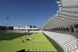 El nuevo estadio tiene capacidad para 10 000 espectadores en sus gradas parcialmente cubiertas y dos pecularidades: una pista principal con el tartán de color verde y una pista auxiliar de calentamiento cubierta y elevada sobre la grada norte que permite que los atletas se ejerciten en condiciones óptimas .[6] La recta es de 110 metros con 9 calles.