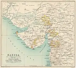 Baroda fue un principado tributario protegido de la India, uno de los principales de la India, directamente dependiente del gobierno general pero de facto de la presidencia de Bombai, puesto que parte del estado estaba en Kathiawar en Guyarat (los estados tributarios). Estaba formado por varios territorios intercalados entre distritos británicos. Los nativos lo denominaban Wadodara, corrupción del sánscrito vatodar (al corazón de los árboles de cuerno). La capital era Baroda conocida también como Virakshetra o Virawati (Tierra de guerreros) y muy antiguamente llamada Chandanavati (por Mana Chandan del clan Dor de los rajputs que lo había arrebatado a los jainistas). Variantes del nombre son Brodera y Borada. La superficie se calcula en 3239,5 km² repartidos entre los 4 territorios principales de Kadi, Baroda, Navsari y Amreli. La población en 1949 se estimaba en tres millones de personas. La capital era Baroda (ciudad) hoy Vadodara.