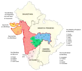 Como resultado del Acta de Reorganización de los Estados Indios el 1 de noviembre de 1956, los distritos de habla canarés de Belgaum (excepto el taluk de Chandgad), Bijapur, Dharwar, y Canara del Norte se transfirieron del estado de Bombay al de Mysore.[6] Sin embargo el estado de Bombay se amplió de manera significativa, expandiéndose hacia el este para incorporar la región de Marathwada de habla marathi del estado de Hyderabad, la región de Vidarbha de habla marathi del sur de Madhya Pradesh, y los estados Saurastra y Kutch de habla guyaratí. El estado de Bombay recibía entre los habitantes del mismo el apelativo de "Maha Dwibhashi Rajya", que significa "el gran estado bilingüe".[4]