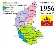 En 1956, el Gobierno de la India llevó a cabo una reorganización completa de los límites estatales, basada en el principio de la lengua compartida. Como resultado se promulgó el Acta de Reorganización de los Estados Indios el 1 de noviembre de 1956, por medio de la cual los distritos de habla kannada de Belgaum (excepto Chandgad taluk), Bijapur, Dharwar, y el Canara del Norte fueron transferidos del estado de Bombay al de Mysore.[3] Los distritos de Bellary, Canara del sur y Udupi fueron transferidos del estado de Madrás y los distritos de Koppal, Raichur, Gulbarga y Bidar del estado de Hyderabad. También el pequeño estado Coorg fue agregado al estado de Mysore, convirtiéndose en un distrito de este.[4][5] Aquellas áreas que hablaban el idioma kannada se unificaron por lo tanto en un solo estado. Como una gran parte de este nuevo estado comprendía el territorio del reino de Mysore, el nombre "Mysore" se mantuvo como el nombre del recién creado estado hasta que pasó a denominarse Karnataka el 1 de noviembre de 1973.