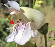 La flecha roja señala el estaminodio velludo en una flor de Penstemon grinnellii.